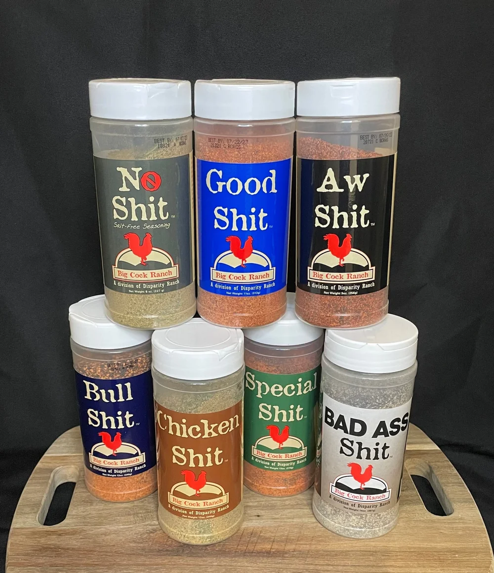 Amazon Com Big Cock Ranch All Purpose Seasoning Set Aw Shit 9oz Bull Shit 12oz Chicken Shit 12oz Good Shit 11oz And No Shit 8oz Gluten Free No Msg Gourmet Seasonings